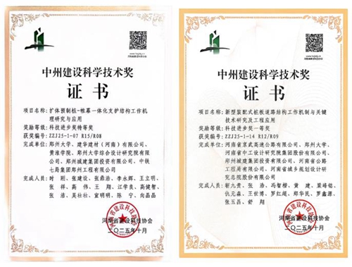 鄭州城建集團的“擴體預(yù)制樁—帷幕一體化支護結(jié)構(gòu)工作機理研究與應(yīng)用”與“新型裝配式樁板道路結(jié)構(gòu)工作機制與關(guān)鍵技術(shù)研究及工程應(yīng)用”兩項科研項目,分獲河南省“中州建設(shè)科學(xué)技術(shù)獎”特等獎和一等獎。
